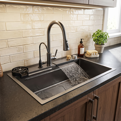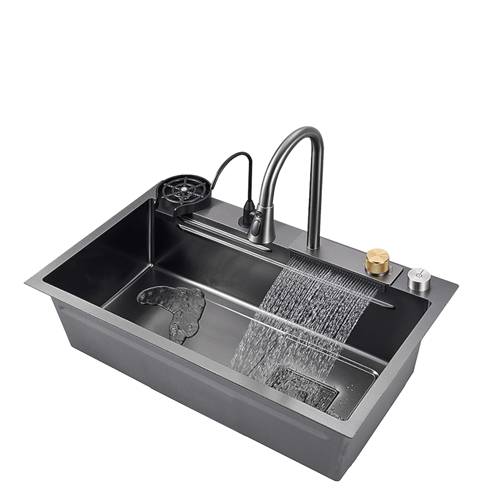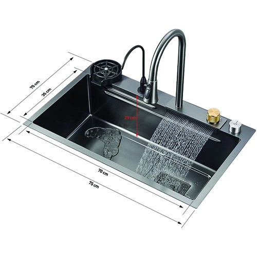 PAKET UKLJUČUJE: Kuhinjski sudoper, spojnicu za sudoper, odvodnu cijev, izvlačnu i vodopadnu slavinu, RO slavinu, dasku za rezanje, nano posudu u posudi (klizna košara), košaru za cjedilo, automatsku posudu za pranje šolja s cijevi i dozator sapuna.